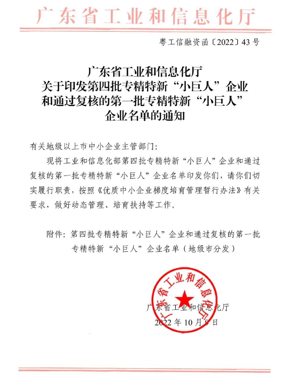 On 9 October 2022, the Department of Industry and Information Technology of Guangdong Province issued a document announcing the list of the fourth batch of state-level "Small Giant" enterprises in Guangdong Province. With our leading technological strength, continuous innovation ability, huge market development potential and excellent achievements in the industry, our company was successfully awarded the honor of "Small Giant" enterprise at the national level.